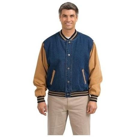 Port Authority Denim And Twill Letterman Jacket Small - Dark Blue/Saddle. J761-63562. Jackets. Soft and comfortable, this retro jacket earns a letter for laid-back style. Reinforced seams and a cotton lining make it perfect for casual outings. Made from 13. 75-ounce, 100 percent cotton stonewashed denim body with cotton twill sleeves. Features cotton body lining, nylon sleeve lining for easy on/off, striped rib knit on collar, cuffs and waistband, snap front, interior chest pocket and front slash pockets. Embroidery will be added to left chest.