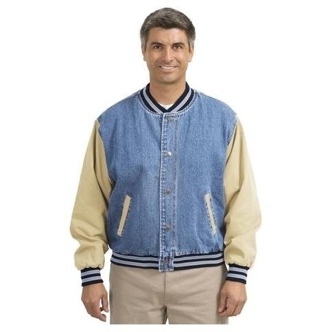 Port Authority Denim And Twill Letterman Jacket Medium - Light Blue/Khaki. J761-63583. Jackets. Soft and comfortable, this retro jacket earns a letter for laid-back style. Reinforced seams and a cotton lining make it perfect for casual outings. Made from 13. 75-ounce, 100 percent cotton stonewashed denim body with cotton twill sleeves. Features cotton body lining, nylon sleeve lining for easy on/off, striped rib knit on collar, cuffs and waistband, snap front, interior chest pocket and front slash pockets. Embroidery will be added to left chest.